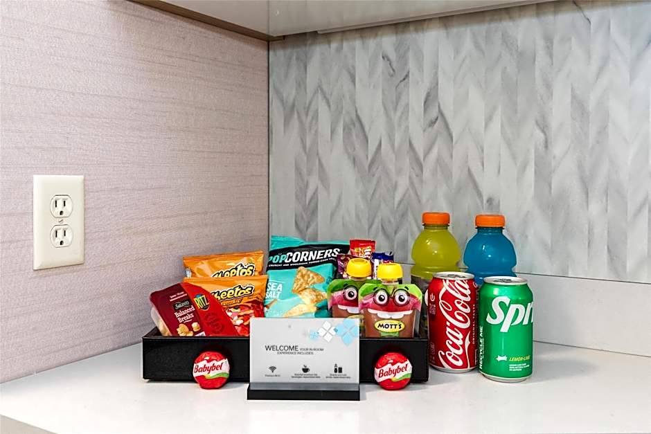 This suite features a flat-screen TV with cable channels, a microwave, refrigerator, and a work desk.